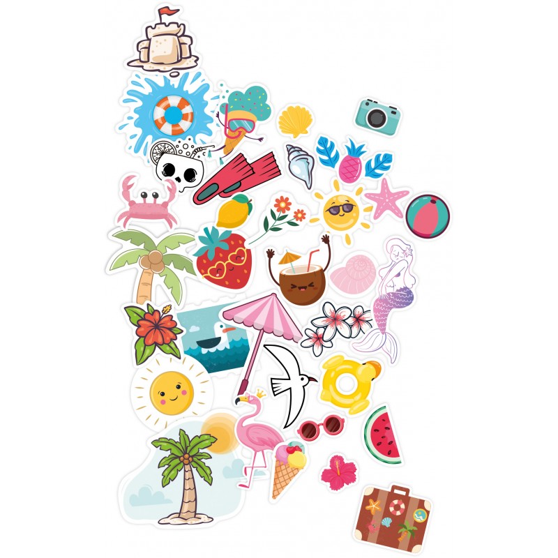 Ice creams, palm trees, fruit, sea animals, surf, beach, shells and lots more.
