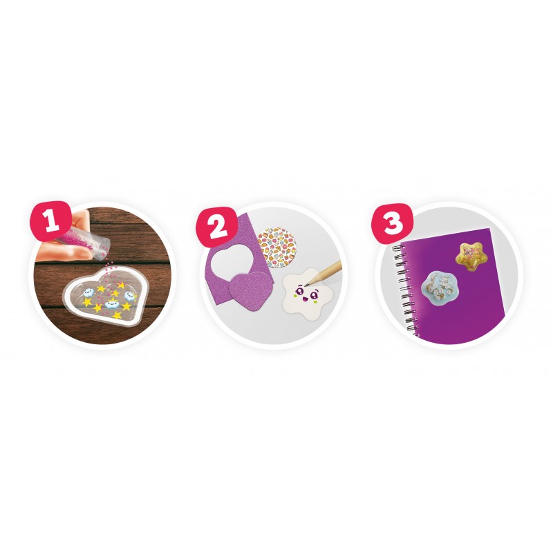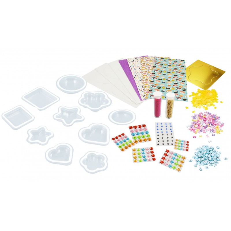 Included : 10 transparent shells, 2 tubes of mini-beads, lots of kawaii decorations, self-adhesive eyes and rhinestones, printed or blank cards to personalise and 1 instruction sheet with colour illustrations.