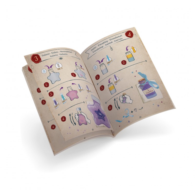 Inclus : 1 Base lumineuse, 1 Chaudron, 4 grands flacons (bouchons métalliques), 11 petits flacons (bouchons en liège), Entonnoir, Gobelet mesure, Petit récipient, Cuillère mesure, Mélangeur, 2 pipettes, Bicarbonate de soude (20 g), Fausse neige (20 g), Colorant fluo rose (10 ml), Colorant fluo vert (10 ml), Colorant rouge (10 ml), Colorant bleu (10 ml), Colorant jaune (10 ml), Colle (20 ml), 6 poudres scintillantes, 5 flacons de paillettes et sequins, Pétales de rose, Etiquettes, Rubans, 4 breloques, Etagère à potions, Câble USB et 1 notice illustrée.