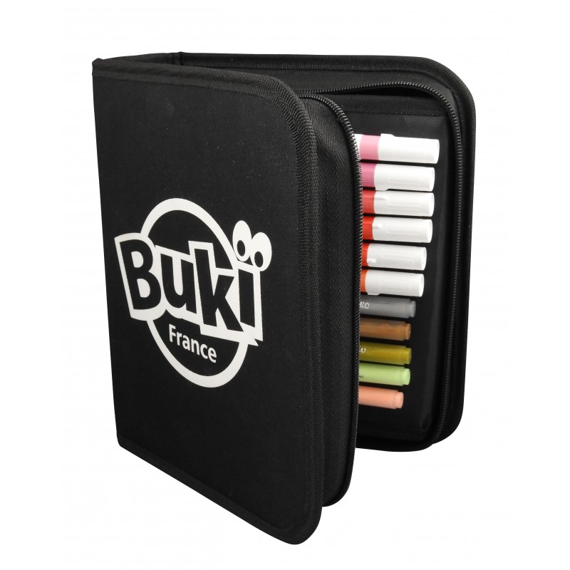 Inclus : 1 trousse avec poignée, 40 feutres acryliques double embouts, 3 feutres acryliques pailletés, 2 feutres acryliques fluos et 1 notice illustrée en couleurs.