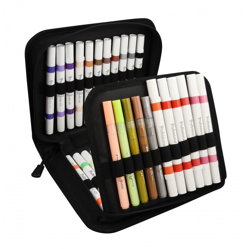 Une trousse avec 45 feutres acryliques conçus pour colorier, dessiner ou écrire sur de multiples supports tels que le papier, le bois, le carton, le métal, le tissu et le verre.