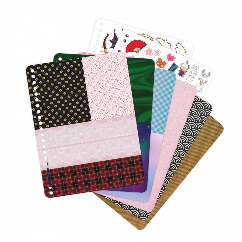 - pochoirs, stickers, coupons de tissus adhésifs pour donner du volume aux créations.