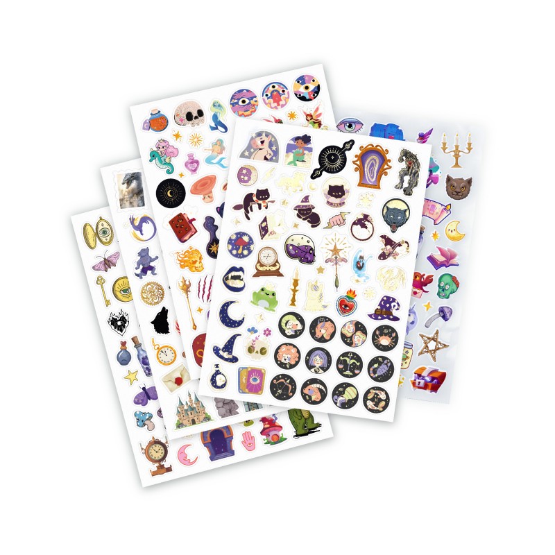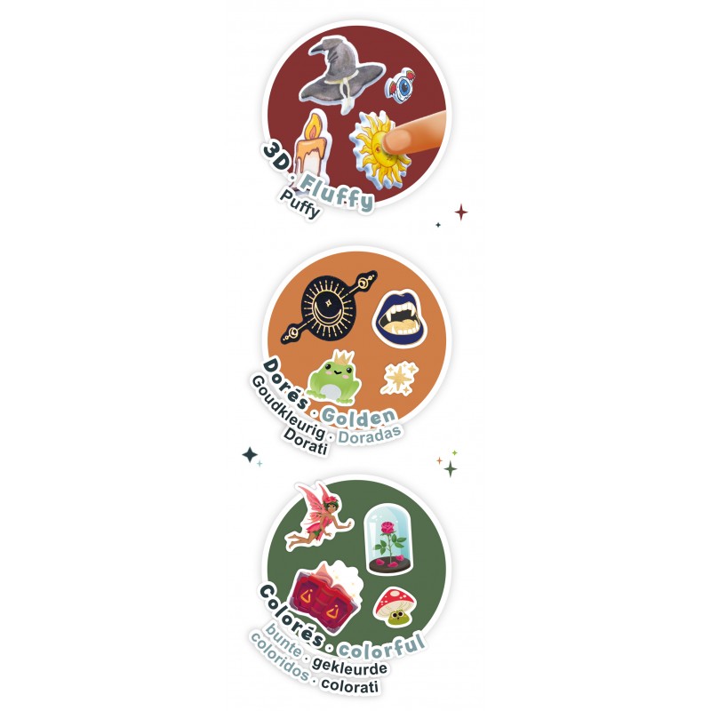 Des stickers potions, grimoires, dragons, licornes, baguettes, animaux mystérieux et bien d'autres encore.