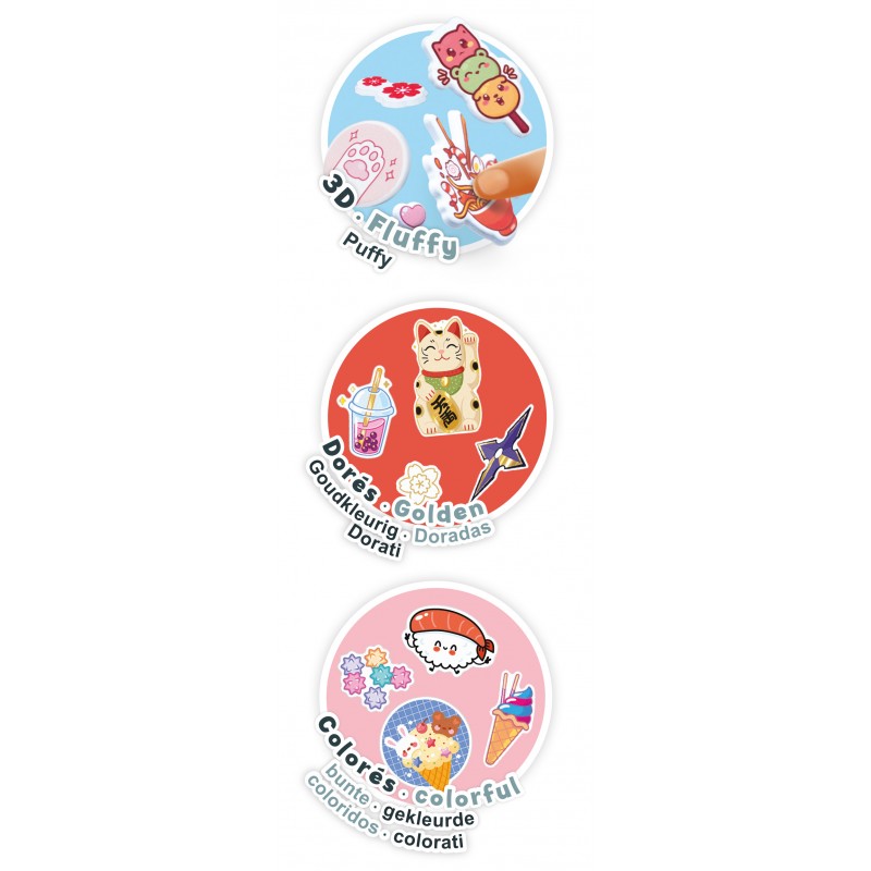 La pochette contient 5 feuilles au format A5 : 3 planches colorées, 1 planche aux contours dorés et 1 planche avec des stickers fluffy (doux et épais).