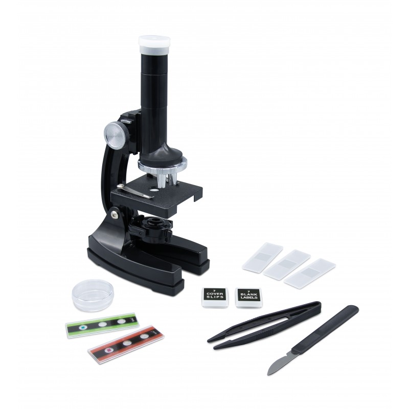 Inclus : 1 microscope, 1 oculaire 10x, 1 molette de mise au point, objectifs, 1 platine avec pinces, 1 éclairage LED, 1 scalpel, 1 pince, 2 lames d’échantillons, 1 boîte de Pétri, 3 lames vides, 7 lamelles et 7 étiquettes, 1 notice en couleurs.
