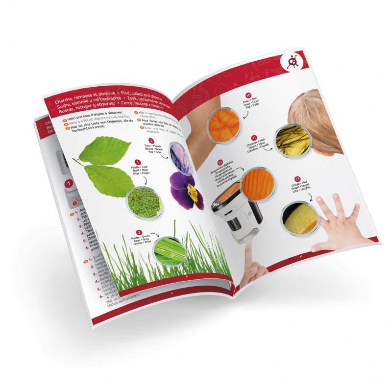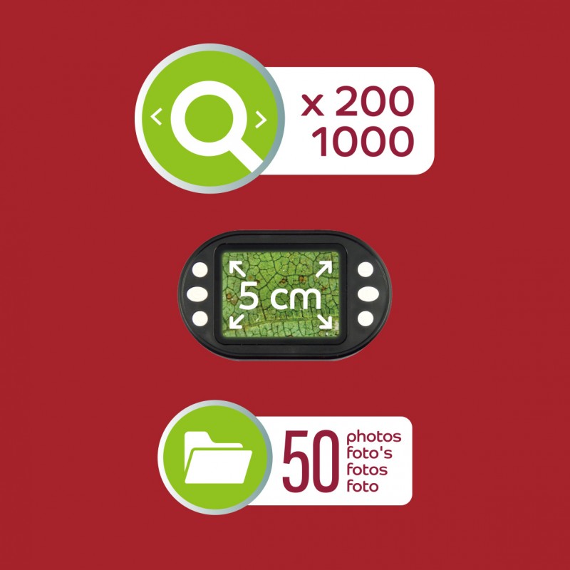 Inclus : 1 microscope, 1 câble USB et 1 notice illustrée en couleurs.